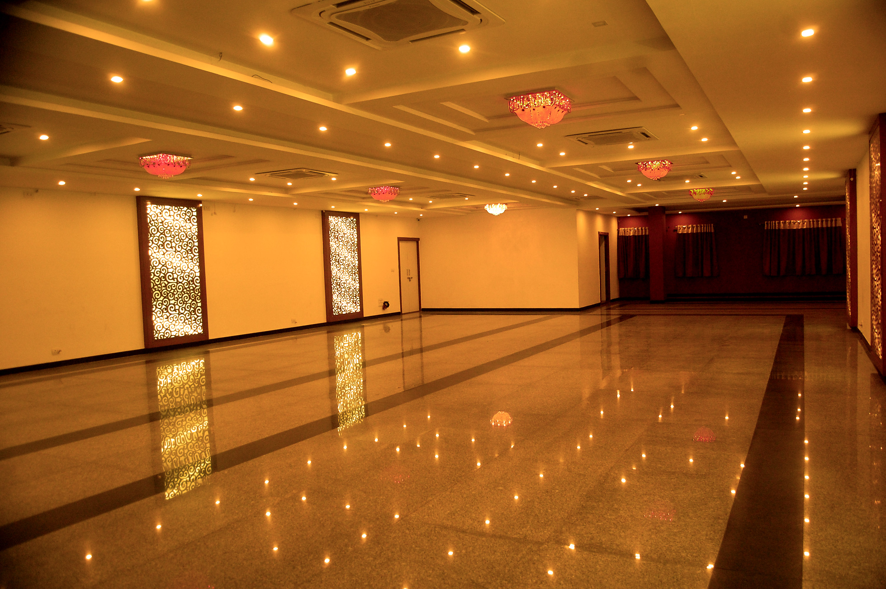 Dimensions of this banquet hall is approximate 3000 sq ft. Theatre style sitting for 300 pax, Cluster style sitting for 200 pax. Round table sitting for 175 pax. U Shape sitting for 120 pax.