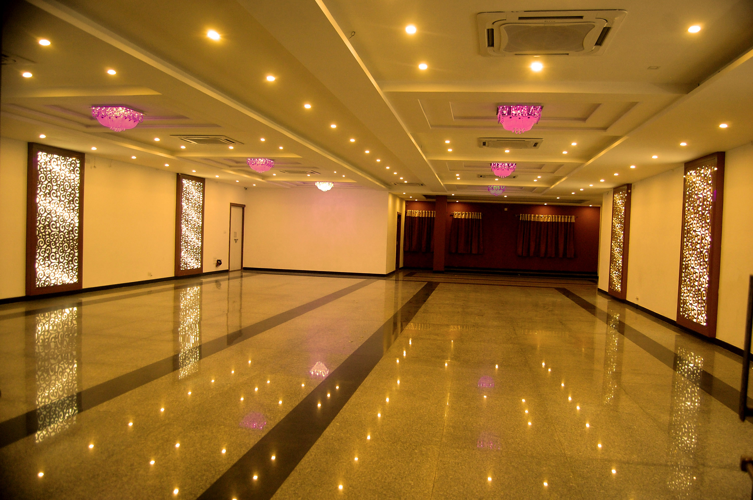 Dimensions of this banquet hall is approximate 3000 sq ft. Theatre style sitting for 300 pax, Cluster style sitting for 200 pax. Round table sitting for 175 pax. U Shape sitting for 120 pax.